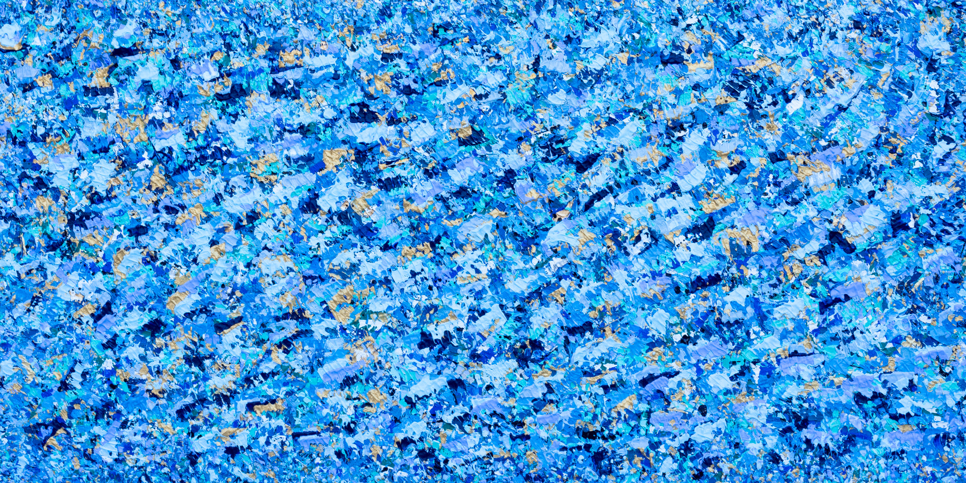 Fields of Blue is a 36x72-inch abstract painting designed to completely transport you to the ocean. This highly layered, richly textured piece captures the movement of rolling tides, the shimmer of light dancing across water, and the quiet power of vast open sea.