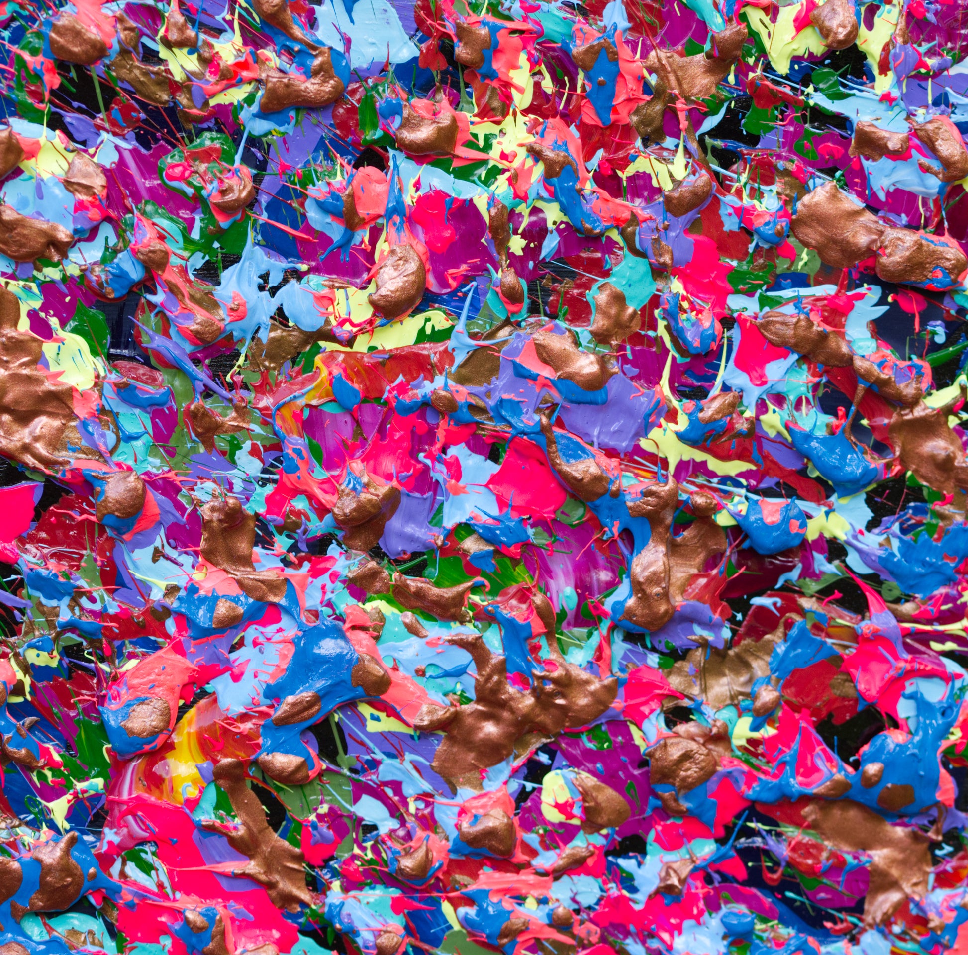 Electric Pink is a bold 6x6-inch abstract painting bursting with energetic pinks, purples, yellows, greens, blues, and copper tones. Designed with a 2-inch bevel and 3D texture along the edging, this piece extends beyond the canvas, creating a striking sculptural effect. The dynamic layering adds movement and depth, making it a standout addition to any space.